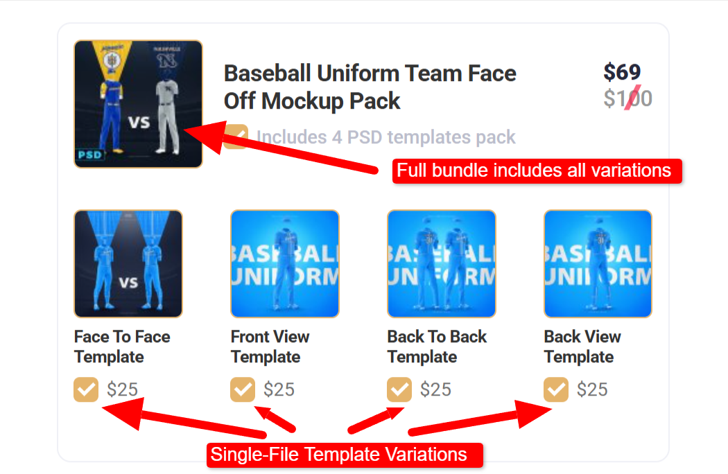 Downloads are priced based on which variation you download of each bundle, and whether you download a full bundle or a single-file variation.